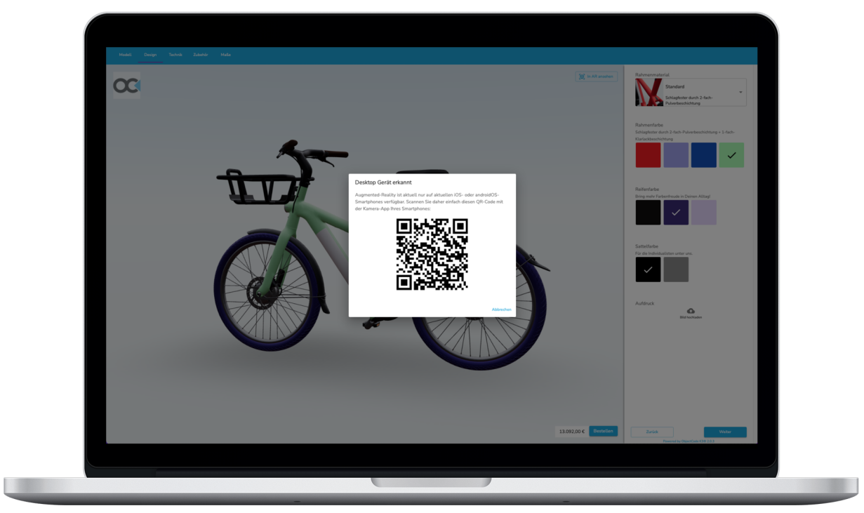 Es gibt mehrere Möglichkeiten, Augmented Reality (AR) für Nutzer:innen anzubieten. Hier sind einige der gängigsten Methoden aufgelistet:1. Integration Online-Shop:Eine Ergänzung des bestehenden Shopsystems mit AR-Komponenten verhilft Desktop- und Smartphone-Nutzer:innen bei der AR-Nutzung. Ein Klick auf „IN AR ANSEHEN“ reicht aus, die AR-Funktion zu starten.Desktop-Nutzer:innen gelangen über einen QR-Code zur Augmented Reality Darstellung. Die Smartphone-Kamera liest diesen aus und schon ist ein E-Bike über die Kamera zu sehen. Wird hingegen ein mobiles Gerät genutzt, fällt der QR-Code weg.Bildunterschrift: Direkt testen: QR-Code mit der Smartphone-Kamera abscannen und den AR-Modus starten.