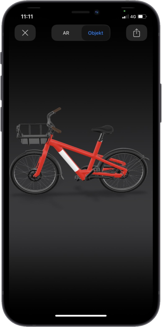 Die Produktwahl fällt auf das rote E-Bike-Modell. Jetzt besteht die Möglichkeit, das Produkt in der realen Umgebung zu erleben. Mit nur einem Klick auf den Button „IN AR ANSEHEN“ starten die technischen Prozesse im Hintergrund! Die AR-Software nutzt eine integrierte Schnittstelle zur Smartphone-Kamera. Ohne Wechsel in eine separate App oder einem Software-Download, erleben Nutzer:innen eine nahtlose Produkterfahrung.